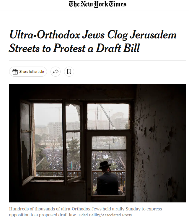 JERUSALEM — In a formidable show of force, at least 300,000 ultra-Orthodox Jewish men flooded the streets around the main entrance to Jerusalem on Sunday, bringing much of the city to a standstill with a protest against a government plan that aims to conscript more of their numbers for military service and holds out the threat of arrest for religious draft dodgers.