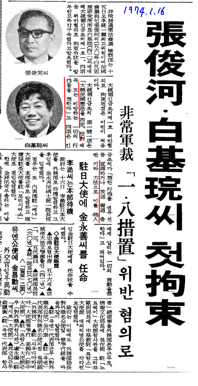 1974년 1월 16일자. 장준하, 백기완 등 긴급조치 1호 위반 구속.