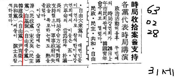 1963년 2월 28일자. 백기완 (31세), 박정희 군사 쿠데타 이후 시국 수습안 강연회, 자유대중당을 대표해서 백기완 선생이 발표를 하다.