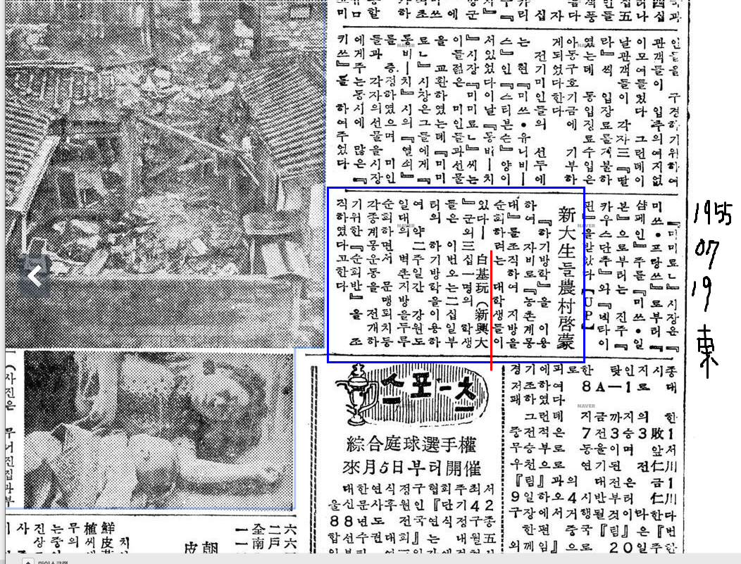 신흥(新興: 경희대 전신)대 백기완 군 외 31명 학생들이 여름방학을 맞이하여 2주간 강원도 벽촌지방을 순회하면서 문맹퇴치 운동을 벌인다는 기사. (* 동명이인인지 확인 필요)