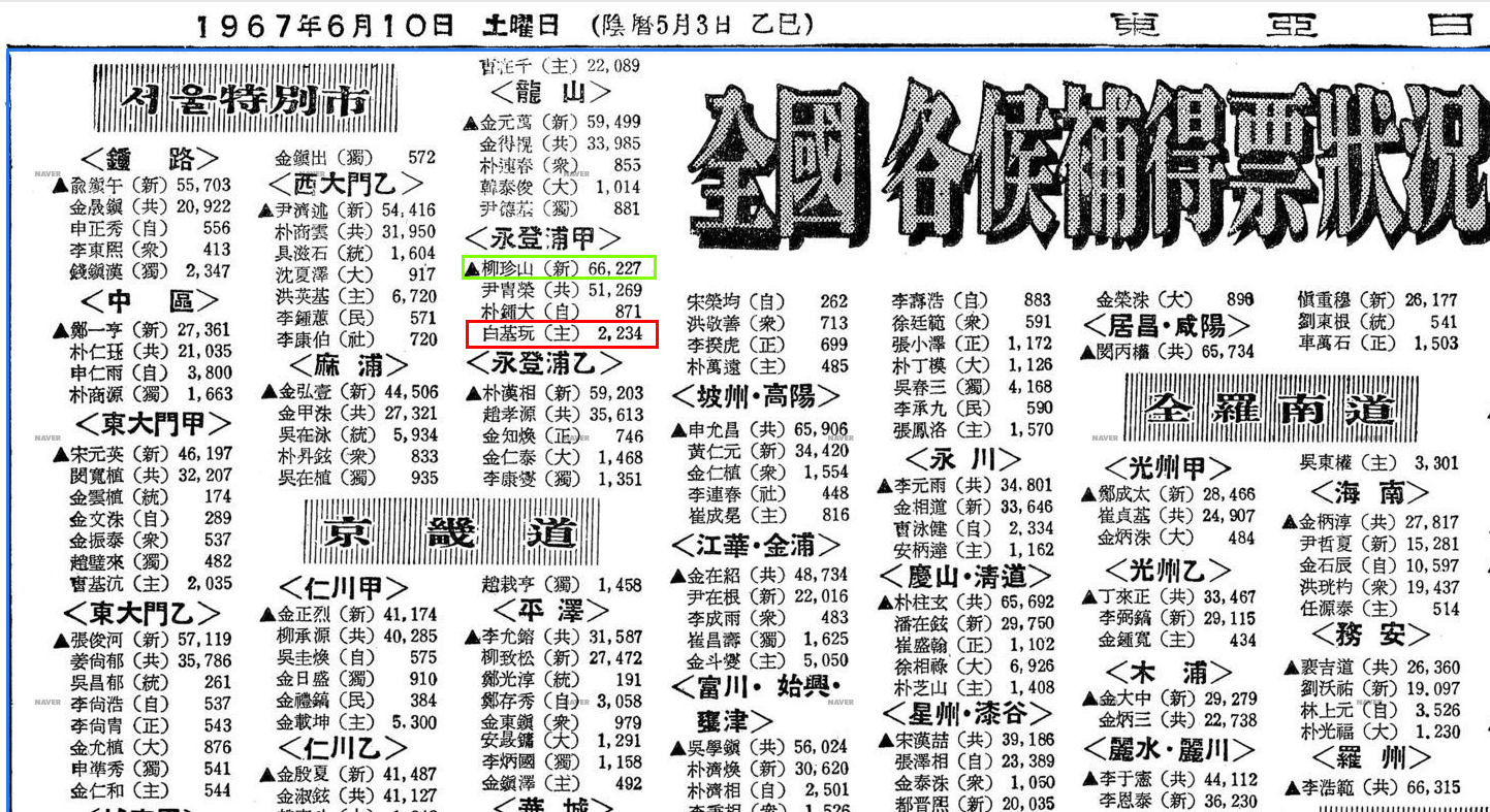 1967년 6월 10일자. 7대 총선 참가. 백기완 (민주당) 서울시 영등포 갑 출마. 신민주당 유진산이 1위, 6만 6227표. 백기완은 당시 35세로 당명을 '민주당'으로 짓고, 출마해서 2천 234표를 얻었다.