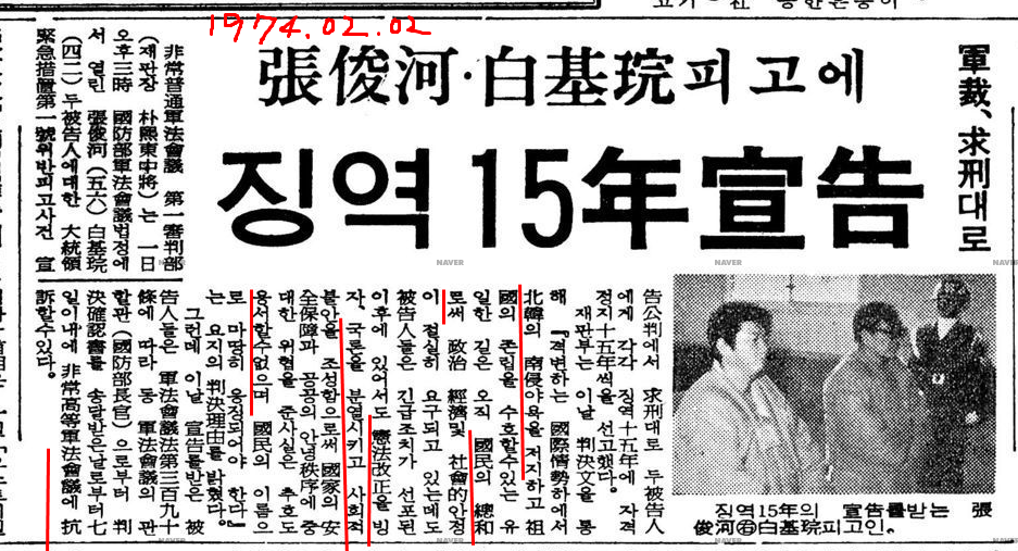 1974년 2월 2일. 비상보통 군법회의, 박희동 중장이 장준화, 백기완 피고에 징역 15년 선고.