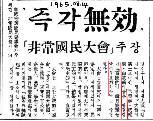 1965년 8월 14일, 함석헌, 백기완 등이 한일협정은 매국적이라고 비판, 즉각 무효화를 주장했다.