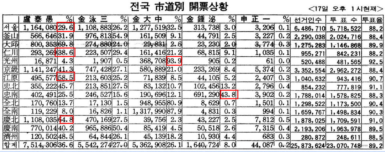 김영삼과 김대중이 얻은 득표율 합산은 53.1%로, 노태우 36.6%보다 훨씬 더 많았다.
