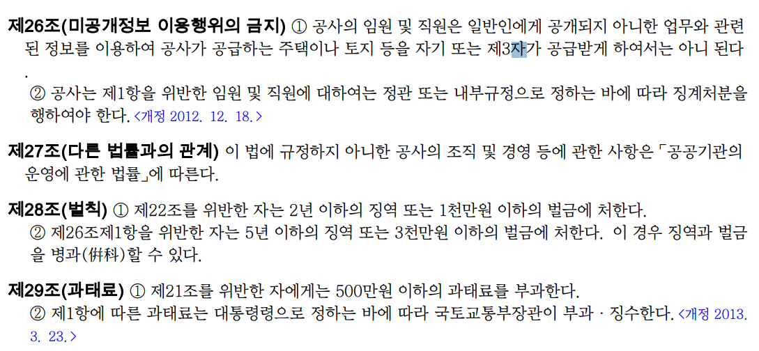 제26조(미공개정보 이용행위의 금지) ① 공사의 임원 및 직원은 일반인에게 공개되지 아니한 업무와 관련 된 정보를 이용하여 공사가 공급하는 주택이나 토지 등을 자기 또는 제3자가 공급받게 하여서는 아니 된다 .