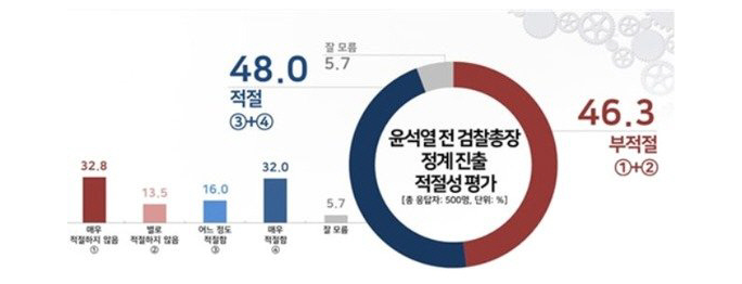 진보정당_리더십/선거 윤석열 정계 진출 찬성 48%, 반대 46.3% by 원시 2021. 3. 8. 조사 주체: 리얼미터 참고 자료. 공유하기 게시글 관리 한국정치 노트 Notes on the Politics of Korea 저작자표시 변경금지 (새창열림) '진보정당_리더십 > 선거' 카테고리의 다른 글 4-7 서울/부산시장 선거 여론조사. 57% 정부심판, 33% 민주당 지지. 정의당 6% 로 제 3당 유지. 40대도 문정부 잘못 48%,잘함 49%로 엇비슷해짐. (0) 2021.03.27 윤석열이 바보냐 ? 시리즈 (5) 서울시장 선거운동원 하지 않는다. 박영선,안철수,오세훈 모두 윤석열 구애. 민주당 박영선 "윤과 편하게 연락할 수 있는 사람" (0) 2021.03.12 윤석열이 바보냐? (4) 윤석열은 안철수 국민의당의 선거도우미 요청을 수락하지 않는다. (0) 2021.03.11 윤석열이 바보냐? 해마 대 붕어 아가미 (3) 박근혜-황교안에게 축출당한 것을 기억 못하면 국힘과 함께, 기억력이 좋으면 '혼자' 가고. (0) 2021.03.05 윤석열 검찰총장 사퇴에 대한 민주당,국힘의 논평, 그리고 정의당 논평의 문제점 (0) 2021.03.04 윤석열 검창총장 사퇴 기자회견 전문 - 자유민주주의와 국민을 보호하겠다. (0) 2021.03.04 윤석열 사퇴 이유과 정치가로서 성공조건 - 보수로 가면 실패. 진보세력 지지 받아야 성공. 제 2의 이회창 되면 100전 100패. (3) 2021.03.04 관련글 윤석열이 바보냐 ? 시리즈 (5) 서울시장 선거운동원 하지 않는다. 박영선,안철수,오세훈 모두 윤석열 구애. 민주당 박영선 "윤과 편하게 연락할 수 있는 사람" 윤석열이 바보냐? (4) 윤석열은 안철수 국민의당의 선거도우미 요청을 수락하지 않는다. 윤석열이 바보냐? 해마 대 붕어 아가미 (3) 박근혜-황교안에게 축출당한 것을 기억 못하면 국힘과 함께, 기억력이 좋으면 '혼자' 가고. 윤석열 검찰총장 사퇴에 대한 민주당,국힘의 논평, 그리고 정의당 논평의 문제점