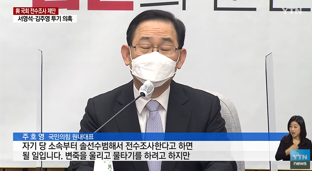 1. 국민의힘 문제점. 김종인과 주호영은 각자 따로 국밥이다. 김종인은 국회의원 300명 투기 전수조사에 찬성하고, 주호영은 '민주당 먼저하고, 국민의힘은 스스로 내부에서 전수조사하겠다'고 했다.