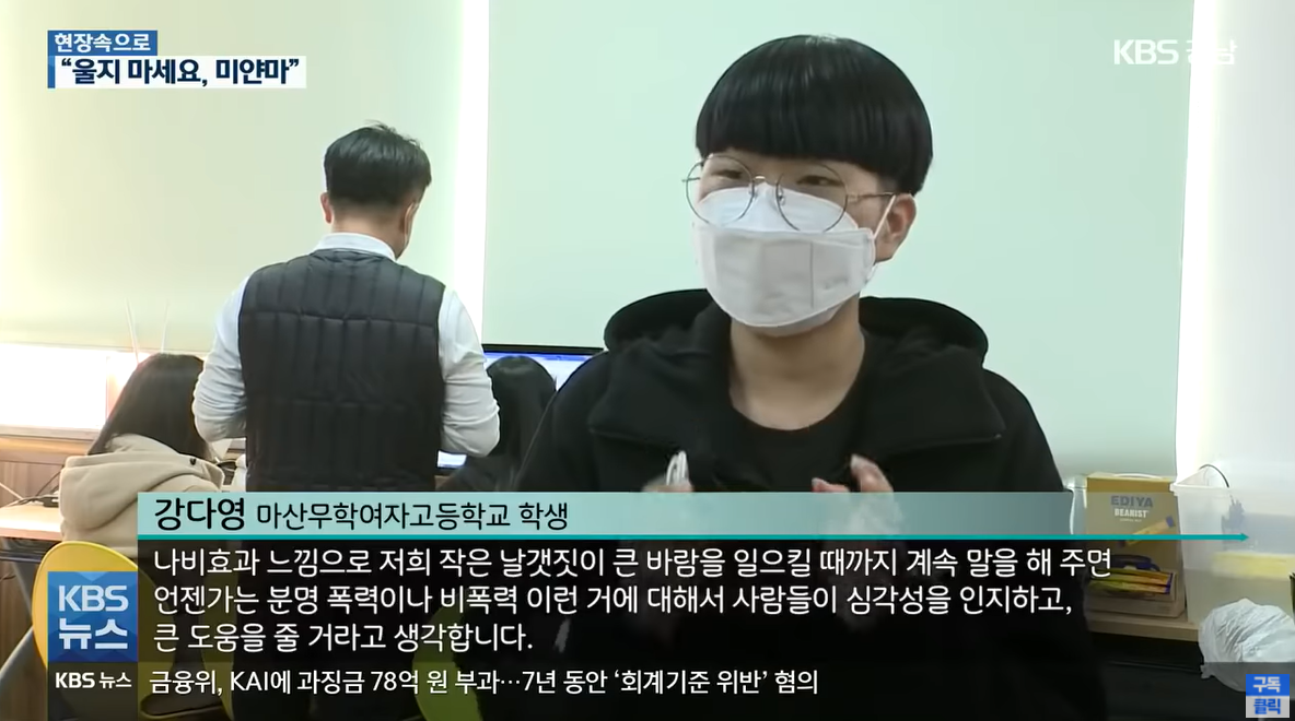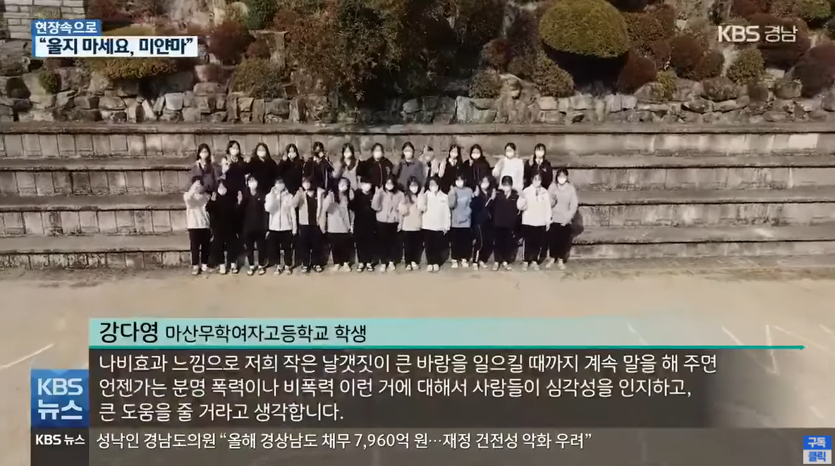 [강다영/마산무학여자고등학교 학생 : "나비효과 느낌으로 저희 작은 날갯짓이 큰바람을 일으킬 때까지 계속 말을 해 주면 언젠가는 분명 폭력이나 비폭력 이런 거에 대해서 사람들이 심각성을 인지하고, 큰 도움을 줄 거라고