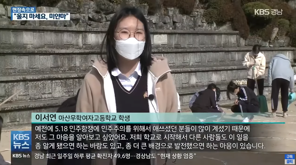 [이서연/마산무학여자고등학교 학생 : "예전에 5.18 민주항쟁에 민주주의를 위해서 애쓰셨던 분들이 많이 계셨기 때문에 저도 그 마음을 알아보고 싶었어요. 저희 학교로 시작해서 다른 사람들도 이 일을 좀 알게 됐으면 하는 바람도 있고, 좀 더 큰 배경으로 발전했으면 하는 마음이 있습니다."]