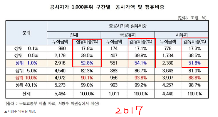 국토부 자료, 상위 0.1%가 총액의 17.1%, 상위 10% 90.1% 각각 차지 서형수 "공시지가 현실화율 올리고 공공용지도 공시대상 포함해야"