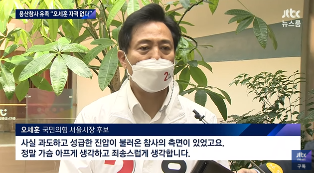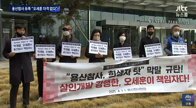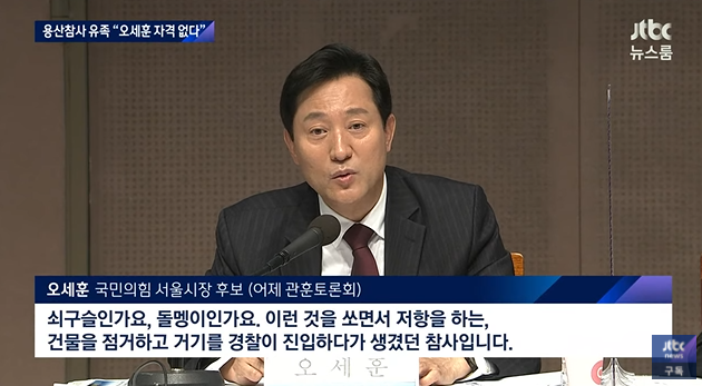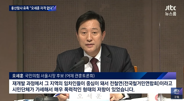 오세훈은 서울시장 후보로서 자격이 없다. 이윤을 추구하는 건설자본의 이익을 대변하는 오세훈은 삶의 터전에서 추방에 저항한 용산 상인들을 '폭력배'로 간주하면서, 용산참사의 원인을 이명박정권의 과잉진압에서 찾지 않고, 망루에 올라가 임차인들의 폭력에서 찾았다.