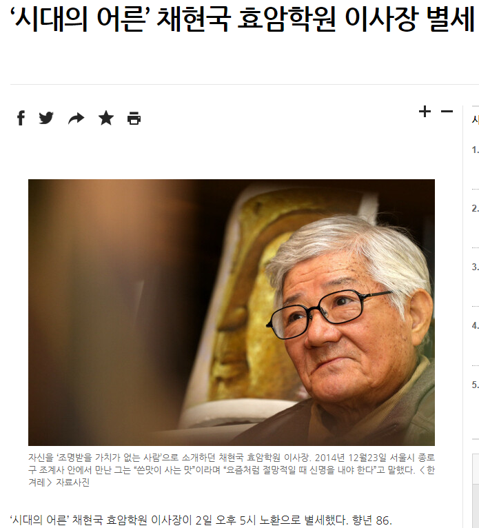 ‘시대의 어른’ 채현국 효암학원 이사장이 2일 오후 5시 노환으로 별세했다. 향년 86. 고인은 일제강점기인 1935년 대구에서 ...