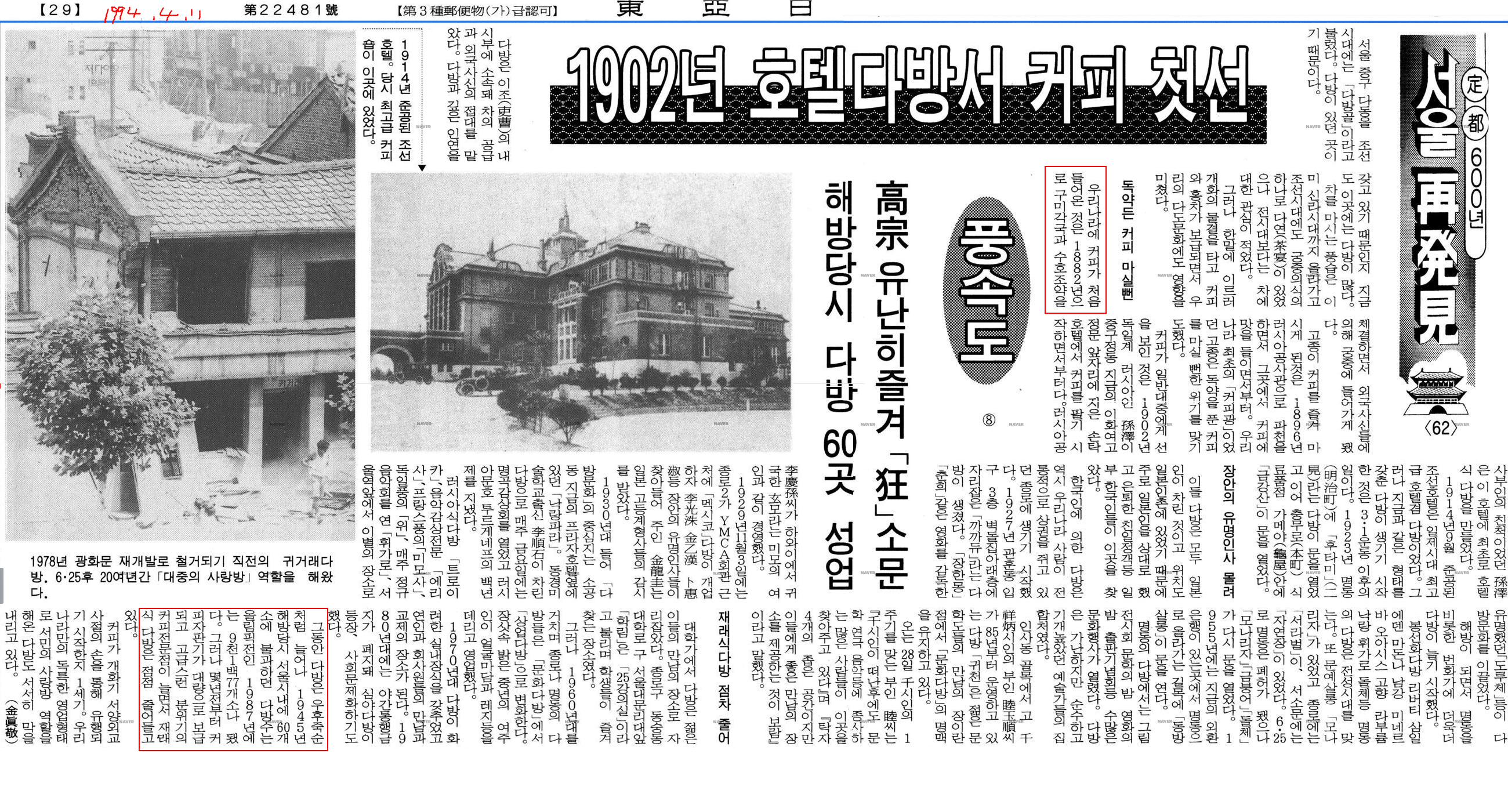 1902년 손탁 호텔에서 커피를 판매하기 시작.