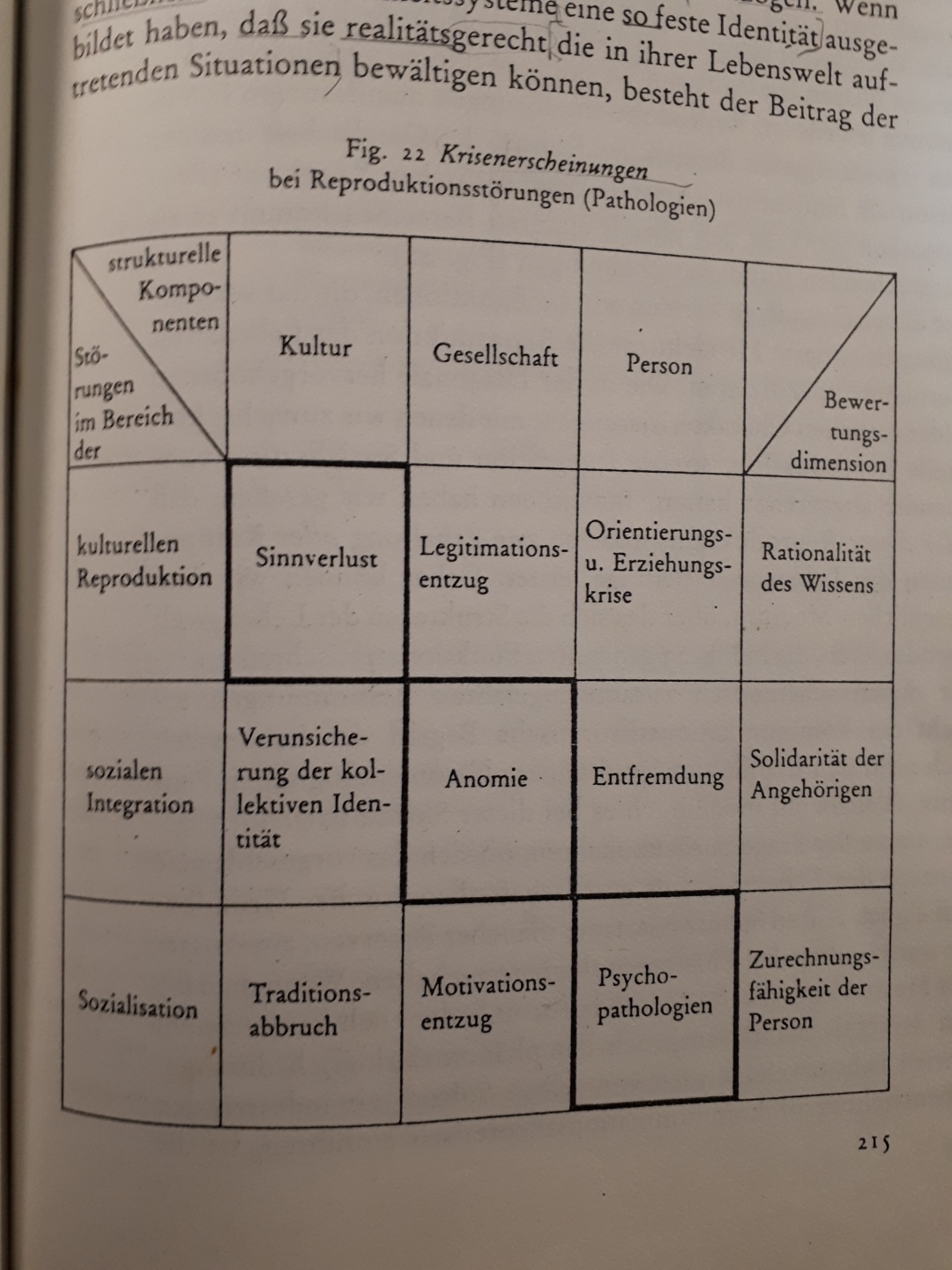 p. 215. 재생산 (문화적 재새상산, 사회적 통합, 사회화) 과정이 방해를 받았을 때 발생하는 위기 현상들