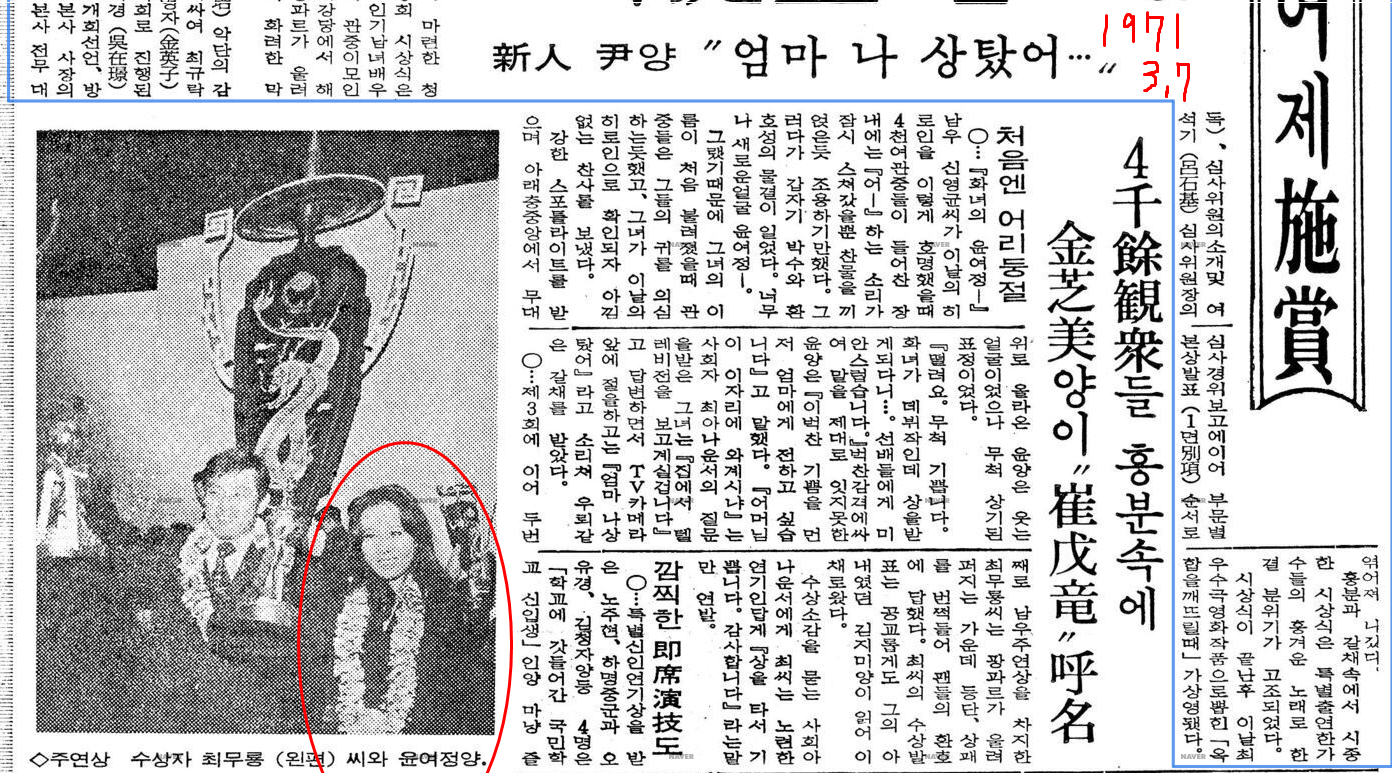 윤여정은 그날 수상식장에 여우주연상이 아니라, 인기상인지 신인상인가를 받을 줄 알고 나갔다고 한 인터뷰에서 밝힌 적이 있다. 심사위원들이 막판에 윤여정으로 수상자를 바꾼 것으로 알려져있다. 물론 <화녀>에서 윤여정의 연기는 탁월했다.