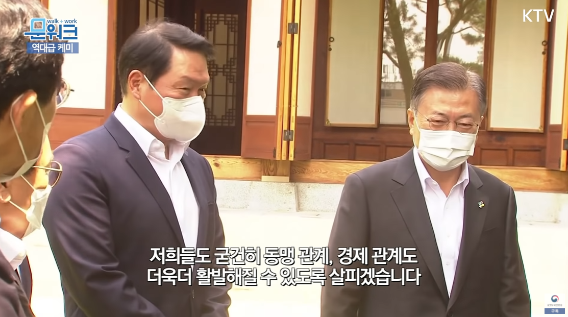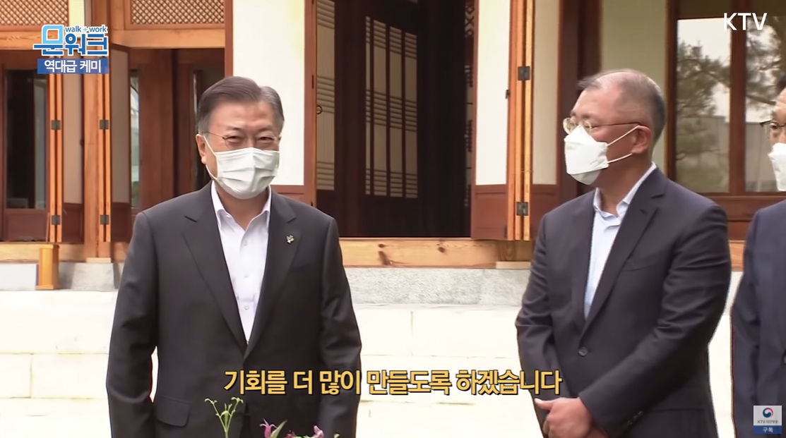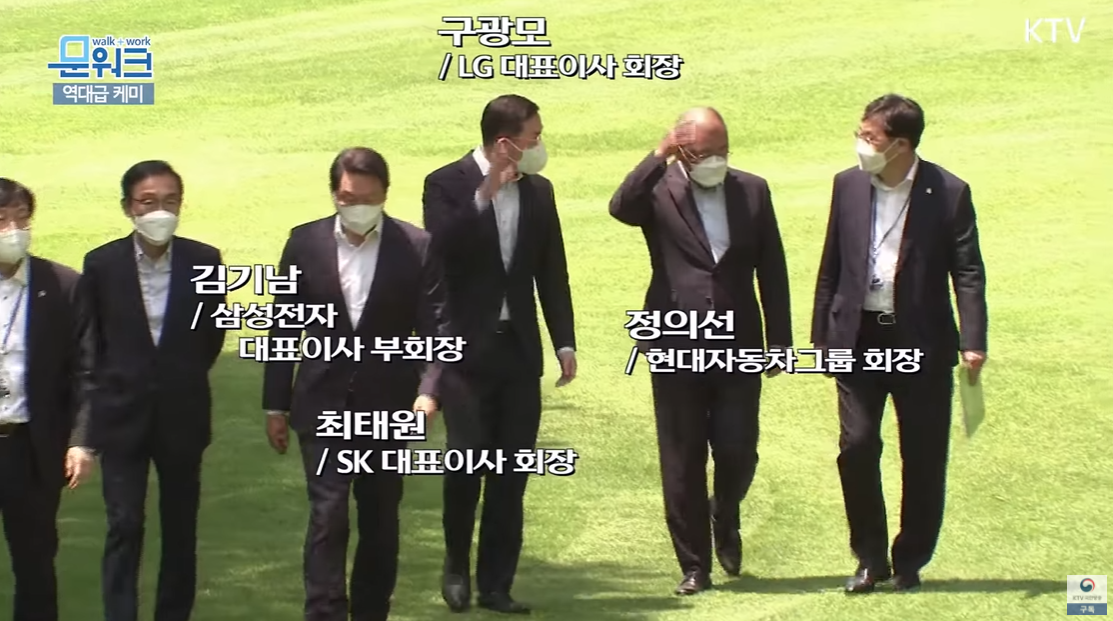 "기업 측에서 김기남 삼성전자 부회장, 정의선 현대자동차 회장, 최태원 SK 회장, 구광모 LG 회장이 참석했다. 우리 경제가 코로나 위기로부터 빠르게 회복하고 재도약하는데 있어, 4대 그룹의 역할이 컸다."