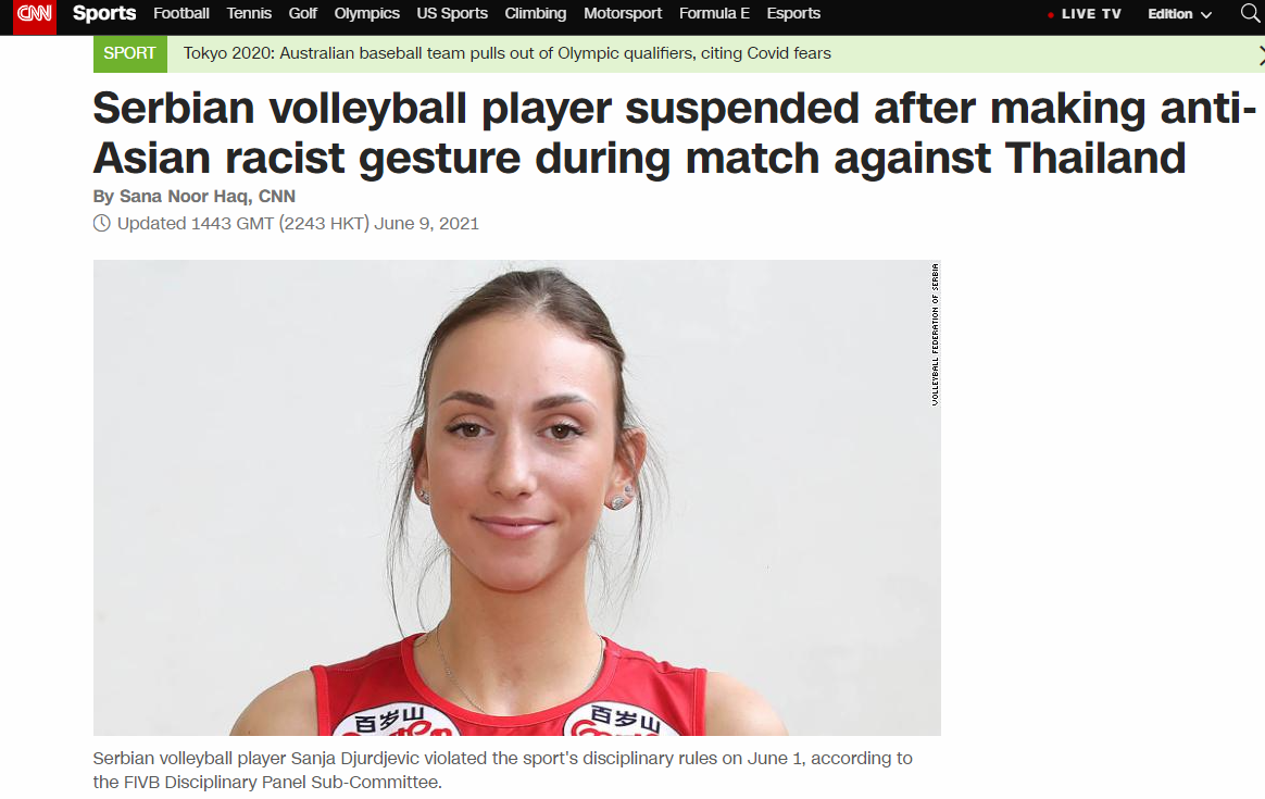 태국과 경기에서, 세르비아 여자 배구선수인 산야 주데비치가, 아시아 사람들을 조롱하는 동작인 '눈찢기'를 했다.