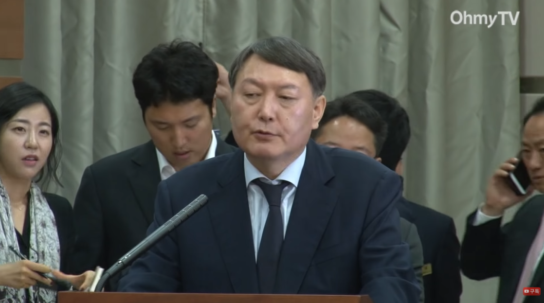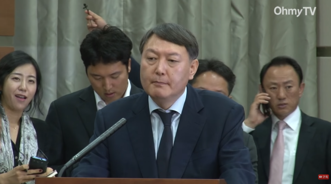 윤석열 검사가 "야당 도와줄 일있냐?"라는 조영권 서울중앙지검장의 말을 그대로 폭로하고 있다. 그 뒤에서 듣고 기자로 보이는 한 언론인이 놀라는 표정을 하고 있다. 그만큼 윤검사의 이 직언과 폭로의 파장은 컸다.
