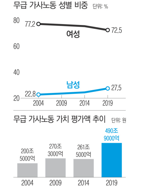 다만 1인 가구가 증가하고 남성의 가사노동 참여가 늘면서 여성의 가사노동 편중 현상은 개선되는 추세다. 남성의 무급 가사노동 시간은 2004년 하루 45분에서 2019년 64분으로 19분 늘었고, 여성의 경우 같은 기간 하루 226분에서 205분으로 21분 줄었다. 이에 따라 가사노동 가치의 성별 구성비도 2004년 여성 77.2%·남성 22.8%에서 2019년 여성 72.5%·남성 27.5%로 개선됐다.