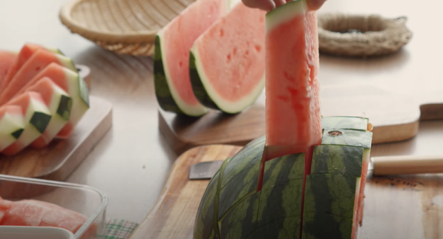 수박 한 통이 순식간에 먹기 좋게 잘라진다. 네모로, 세모로, 얇게. 네모반듯한 수박을 보관 용기에 가지런히 담는 모습을 보는데 왠지 기분이 편안해진다. 수박을 자를 엄두가 안 나서 혹은 귀찮아서 반으로 자른 수박을 파먹어 본 사람이라면, 남은 수박은 어떻게 해야 하나 난처했던 경험이 있는 사람이라면, 더욱더 영상에서 눈을 뗄 수 없을 것이다.