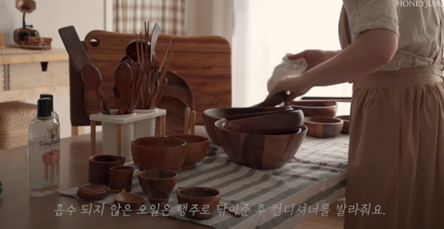 살림 유튜버 꿀주부가 나무 도마를 관리하는 모습. 꿀주부 유튜브 캡처