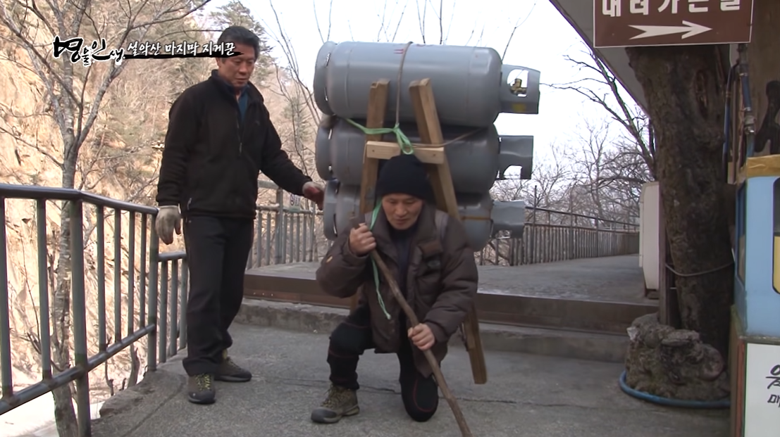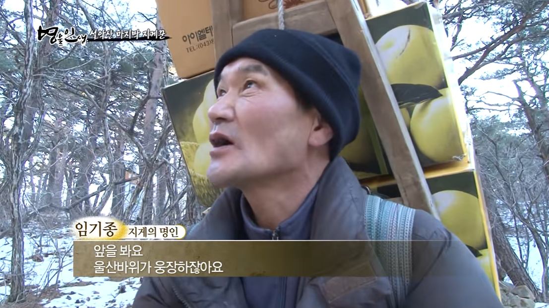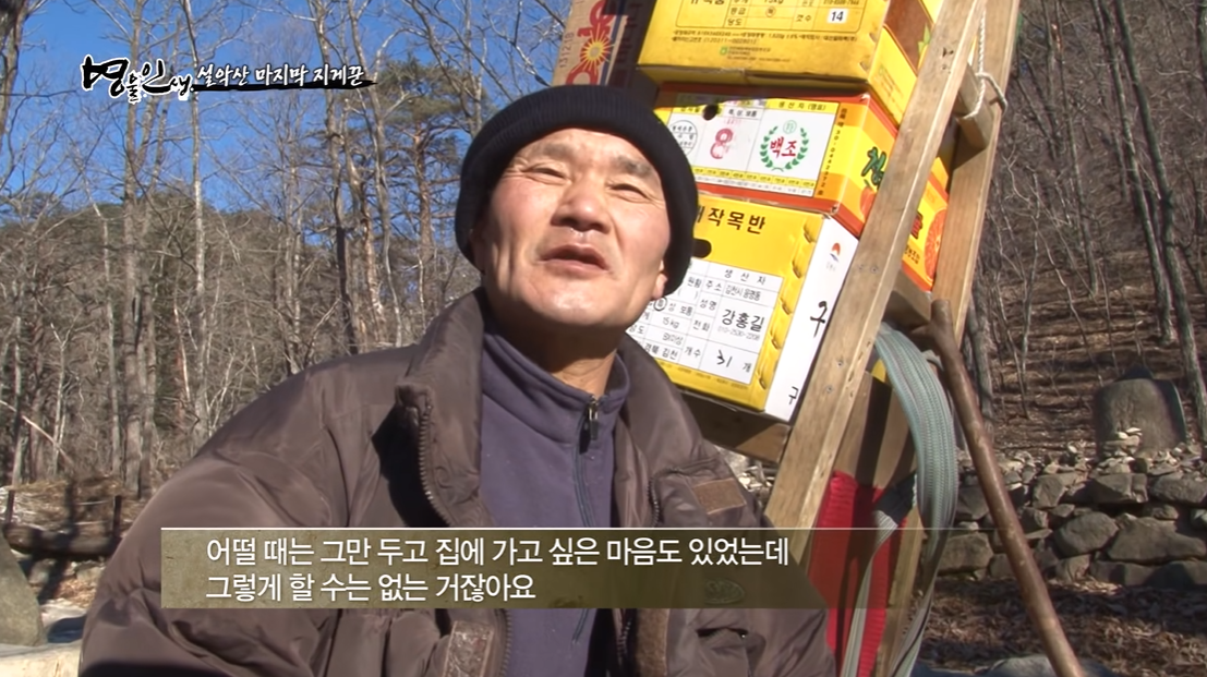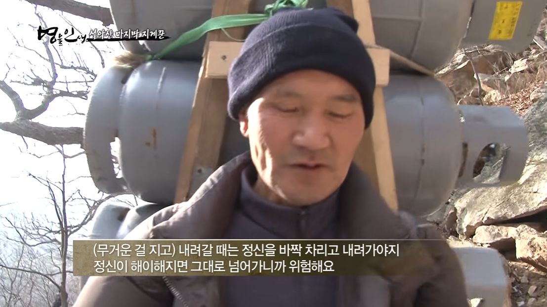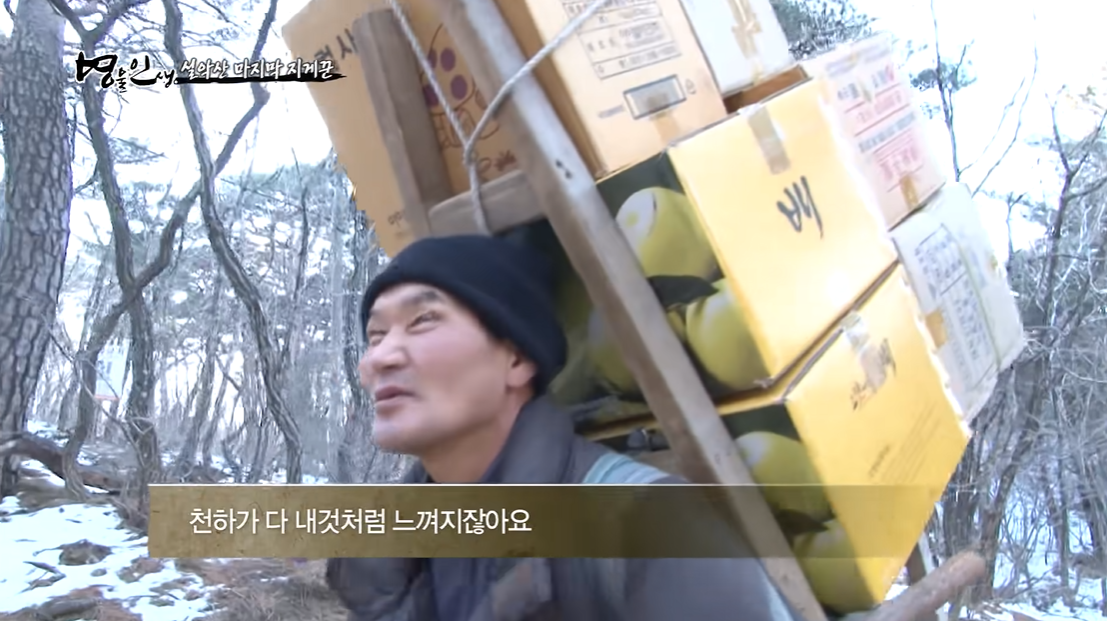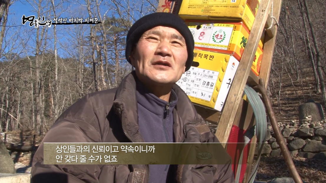 상인들과 약속을 지키기 위해, 무거운 짐을 지게에 지고 설악산을 오르다.