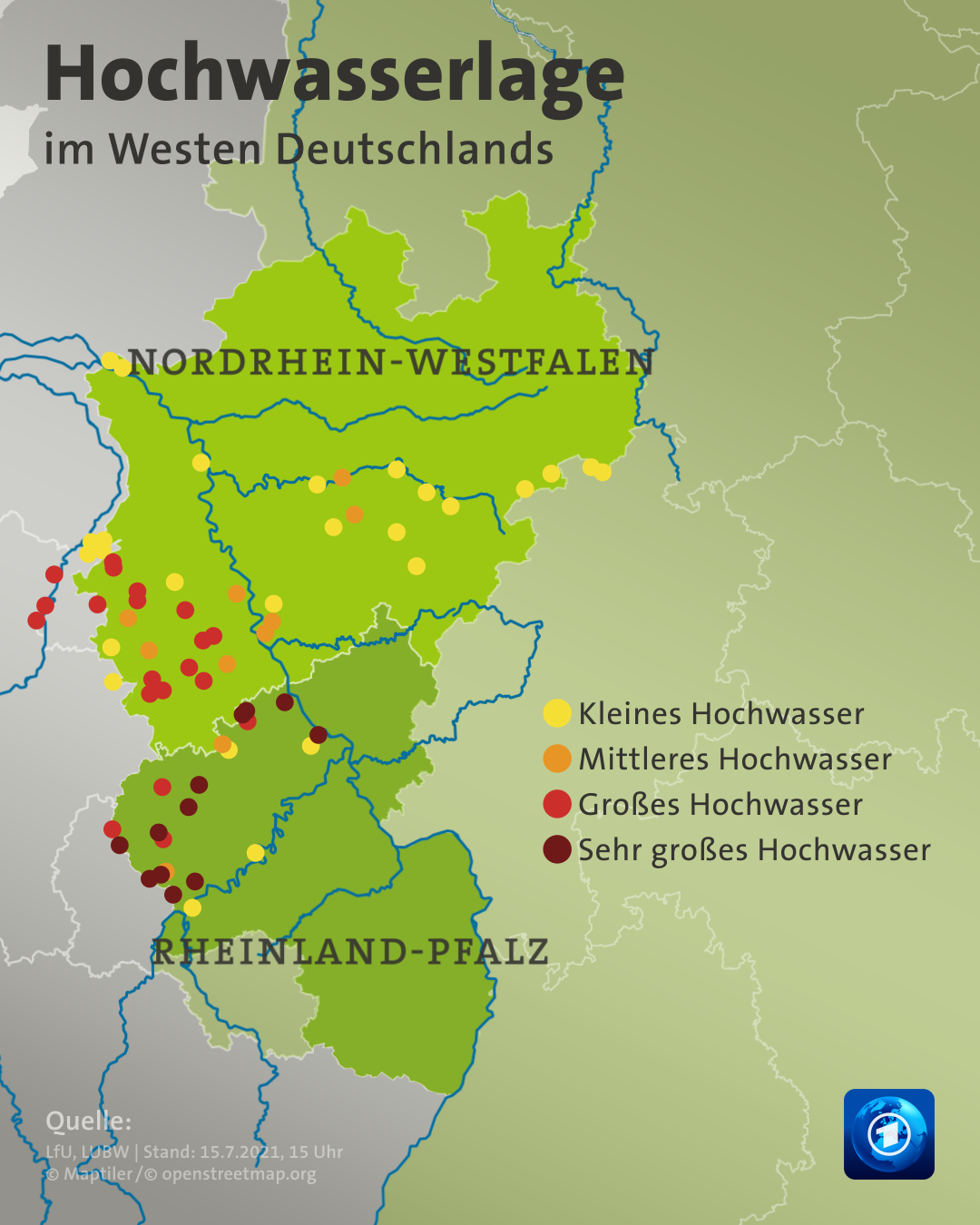 Die Polizei hat inzwischen eine Telefon-Hotline eingerichtet, an die sich besorgte Angehörige wenden können, wenn sie jemanden vermissen. Sie ist unter der Nummer 0800-6565651 erreichbar. Außerdem bittet das Polizeipräsidium Koblenz die Menschen im Kreis Ahrweiler um Mithilfe bei der Suche nach Vermissten. Sie sollen Videos und Fotos an die Polizei schicken, die Hinweise auf vermisste Personen und mögliche weitere Tote im Kreis Ahrweiler geben können. Fotos und Videos können unter https://rlp.hinweisportal.de/ hochgeladen werden.