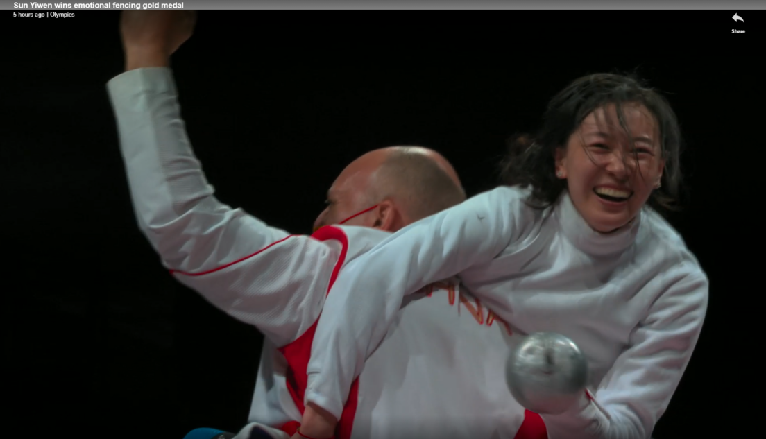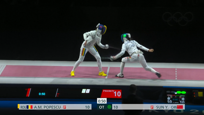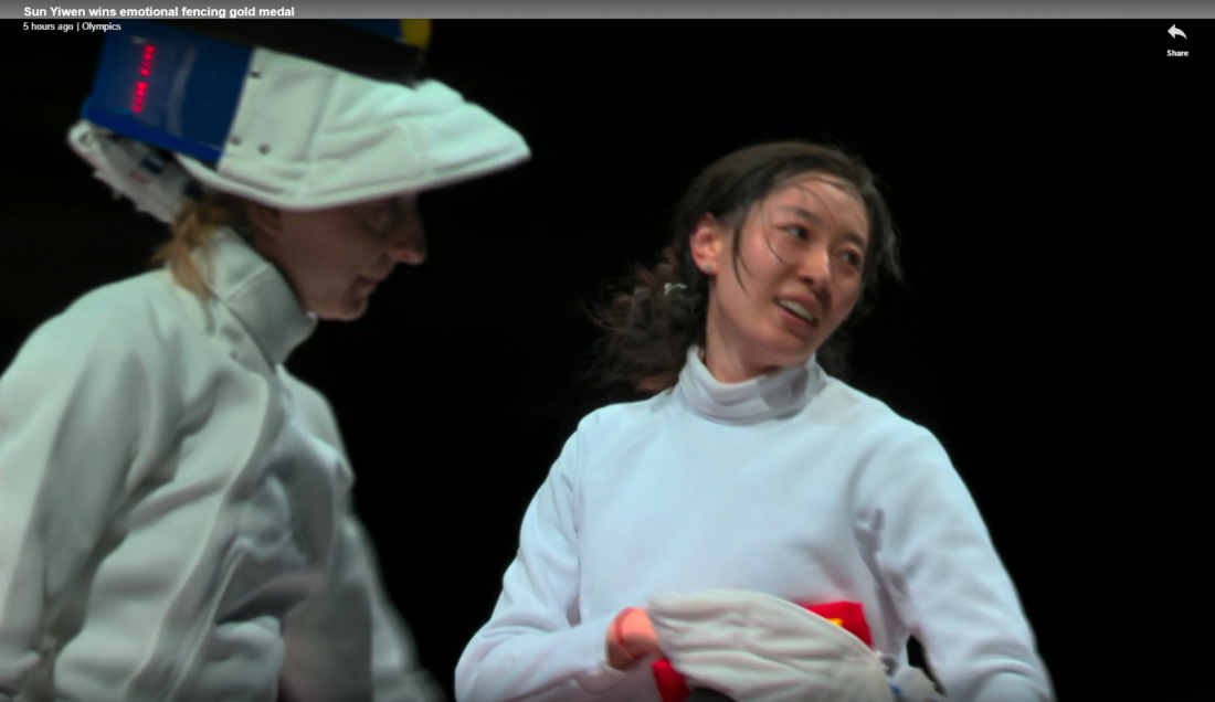 펜싱 경기에서 중국 선위엔이 이기는 장면.