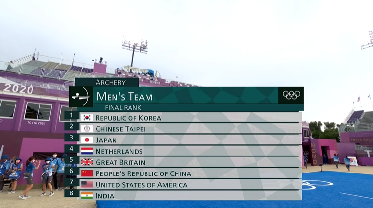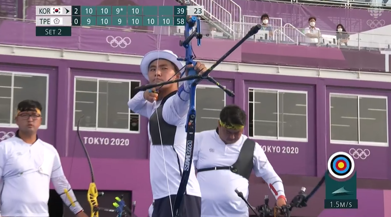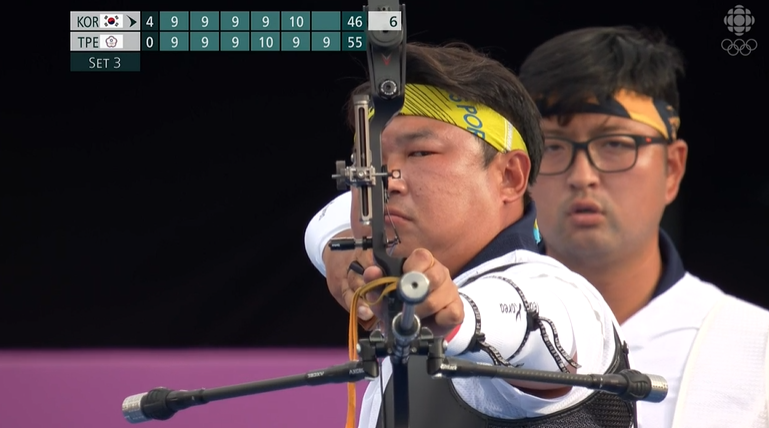 -3세트 마지막 타이완이 10, 9, 9을 쏘고, 한국이 9, 10,10을 쏴, 1점 차이로 56대 55로 이김. 금메달 축하보다도, 활쏘기 경기가 올림픽 경기 중에 제일 재미있음.