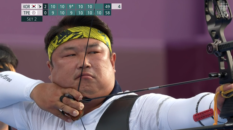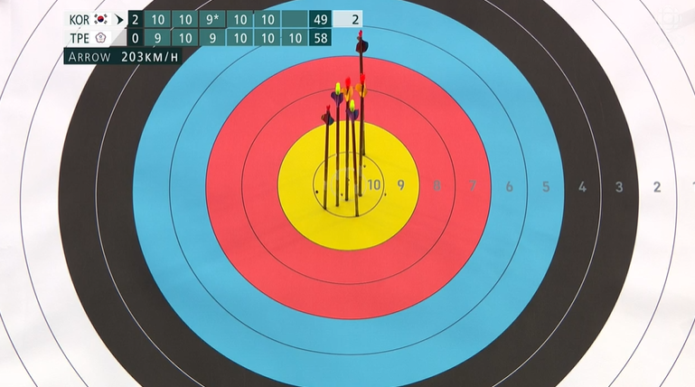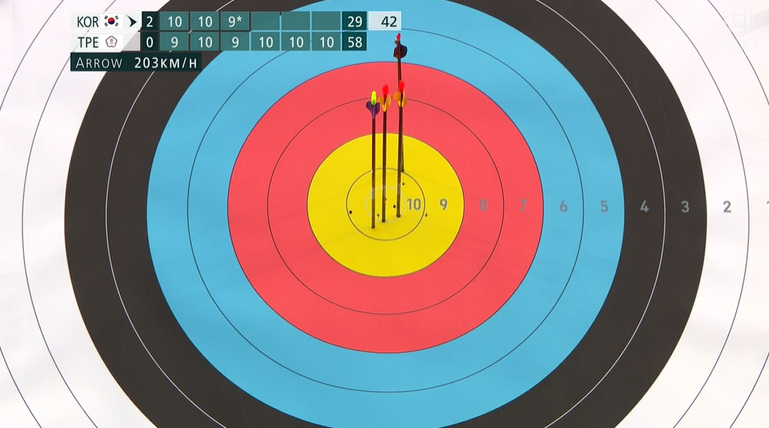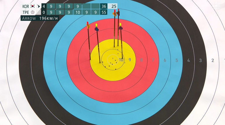 maximum possible 60점을 쏨. 올림픽 경기 중에 꼭 보는 종목이 '활쏘기'인데. 6번 쐈는데, 5개는 10이고, 1개는 9와 10사이에 물려 9* 로, 타이완을 이기는 중임.