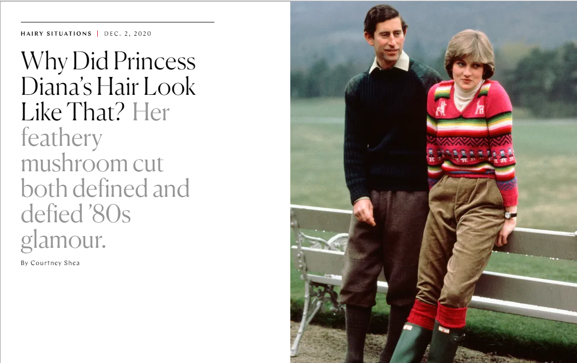 다이애나가 이 짧은 머리를 하기 전에, 미용사 샘 맥나이트에게 물어봤다고 한다. 자기 머리 스타일을 영국 왕가에 신경쓰지 않고, 자기 맘대로 할 수 있다면 어떻게 하는게 좋겠냐고. 샘 맥나이트가 권유한 게, "짧게 치자 cut it short"고 한다.