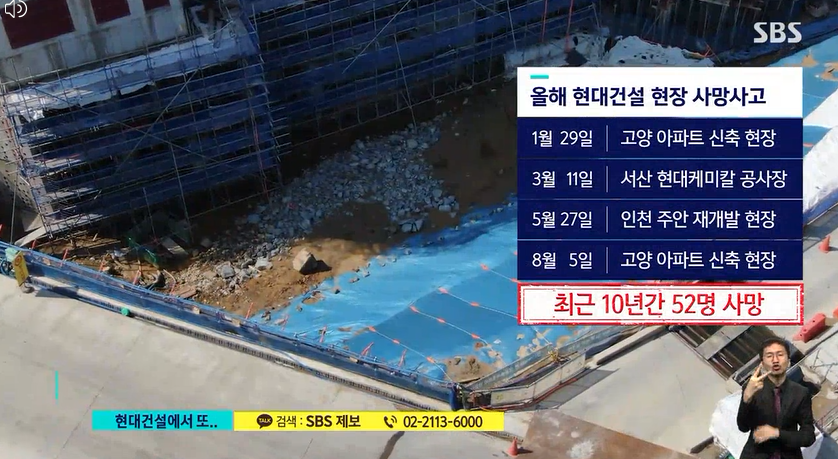 3) 현대건설 공사현장, 최근 10년 사이 52명 노동자 사망. 2021년 4명 노동자 사망.