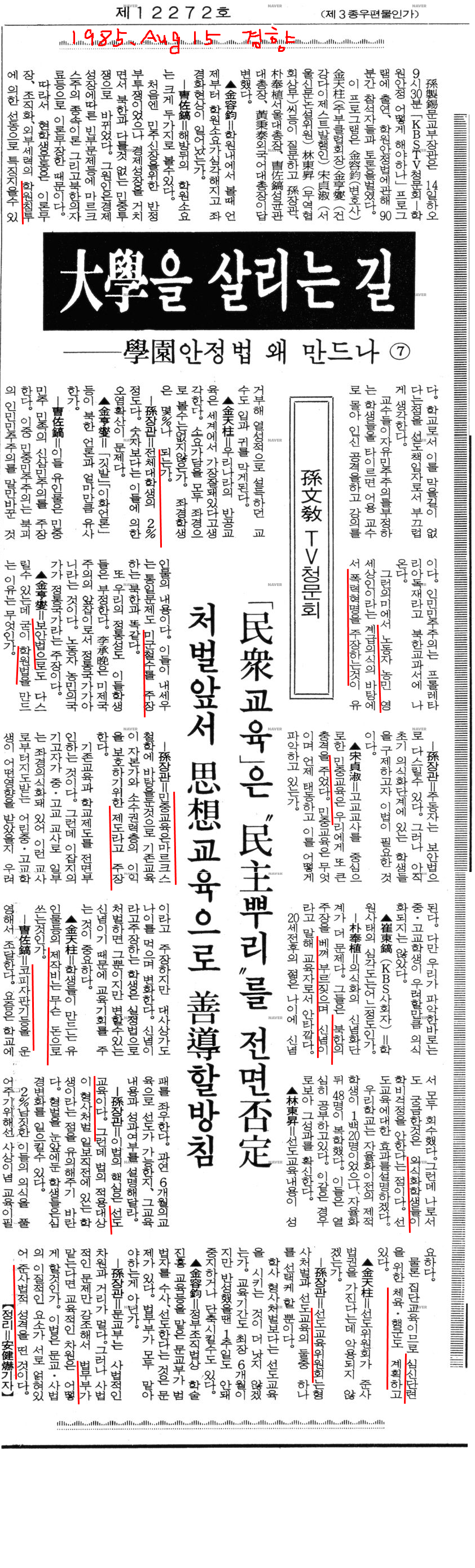 아래 경향신문 기사 핵심 단어. 민중교육 고등학교 교사. 한국 대학가 마르크스주의 사상. 북한의 반미 구호. 학원안정법. 보안법. 성균관대 총장 조좌호. 손제석 문교부 장관. 방봉식 서울대 총장.