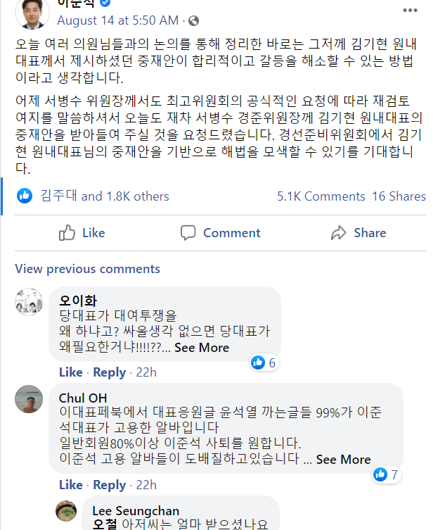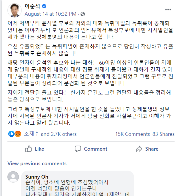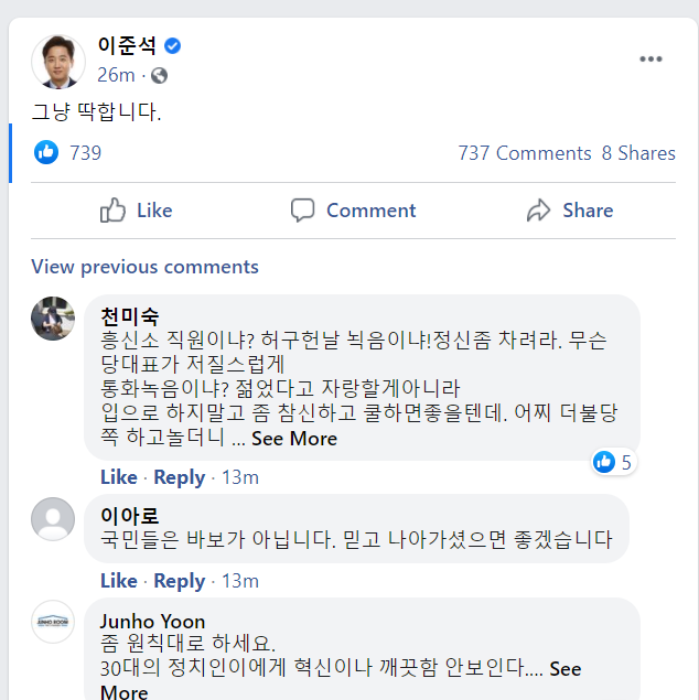 이준석 대표 역시 윤석열, 최재형의 말실수처럼 똑같이 페이스북에서 주로 하는 일이 '실수에 대한 해명', 즉 적극적이고 내실있는 보수파 정치내용은 온데간데없고, 주로 정치적 변명이나 실수에 대한 졸속 마무리이다.