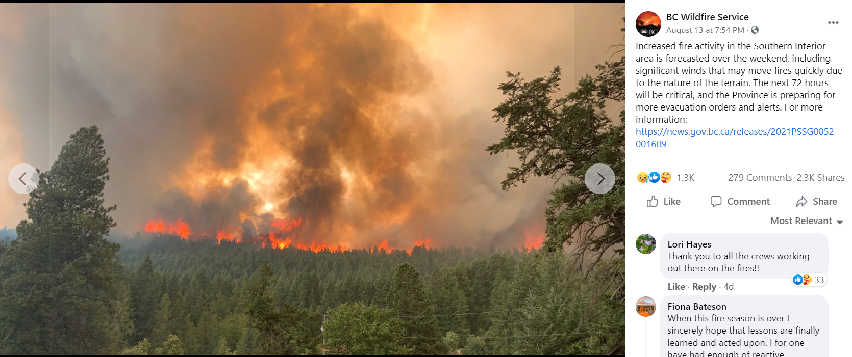 It is also the time to remind yourself that when you post something out of anger, frustration, fear, or heartbreak, there are other families out there feeling all those same things and reading your words that may be hurtful. Please be kind, stay calm, and know that the BC Wildfire Service is fighting for British Columbia’s safety every single day.”