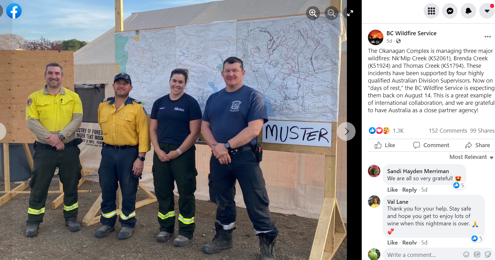 The Okanagan Complex is managing three major wildfires: Nk'Mip Creek (K52061), Brenda Creek (K51924) and Thomas Creek (K51794). These incidents have been supported by four highly qualified Australian Division Supervisors. Now on "days of rest," the BC Wildfire Service is expecting them back on August 14. This is a great example of international collaboration, and we are grateful to have Australia as a close partner agency!