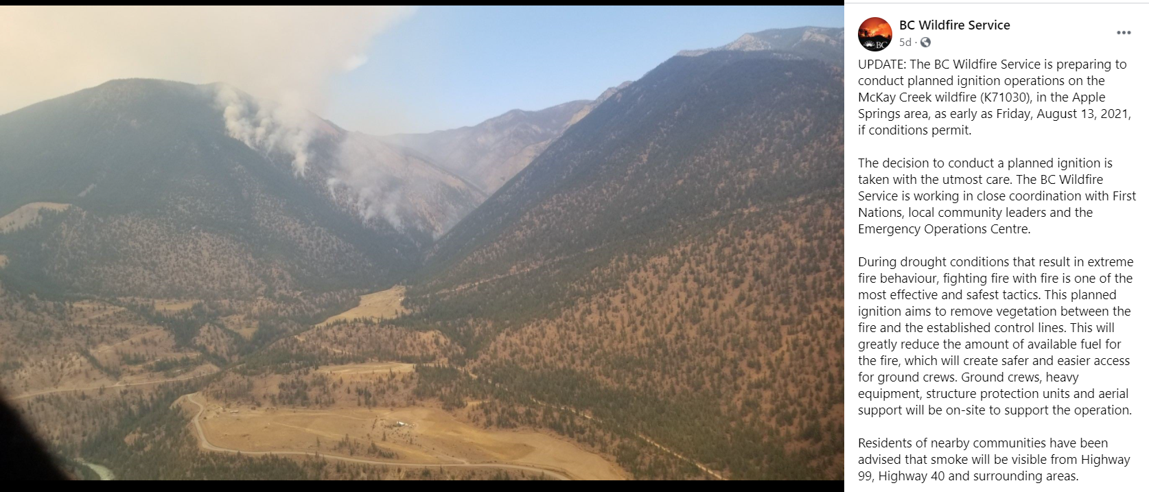 UPDATE: The BC Wildfire Service is preparing to conduct planned ignition operations on the McKay Creek wildfire (K71030), in the Apple Springs area, as early as Friday, August 13, 2021, if conditions permit.