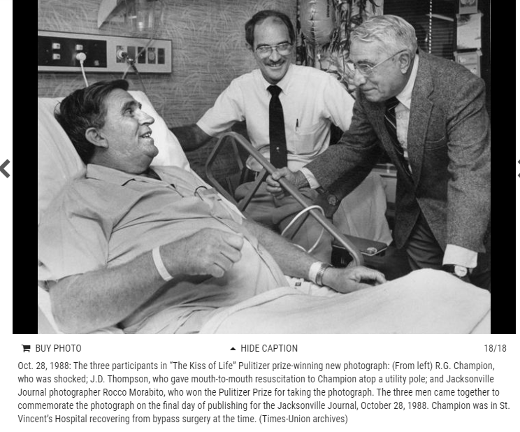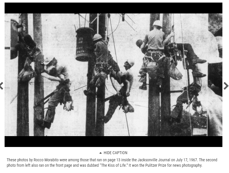 Rocco Morabito won the 1968 Pulitzer Prize for Spot News Photography for “The Kiss of Life”.The photograph was published in newspapers around the world. Morabito, born in Port Chester, New York, moved to Florida when he was 5, and by age 10 was working as a newsboy, selling papers for the Jacksonville Journal.