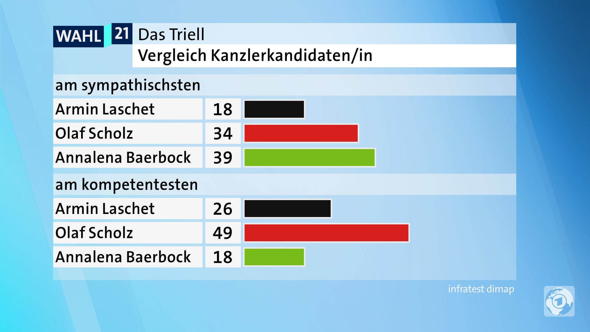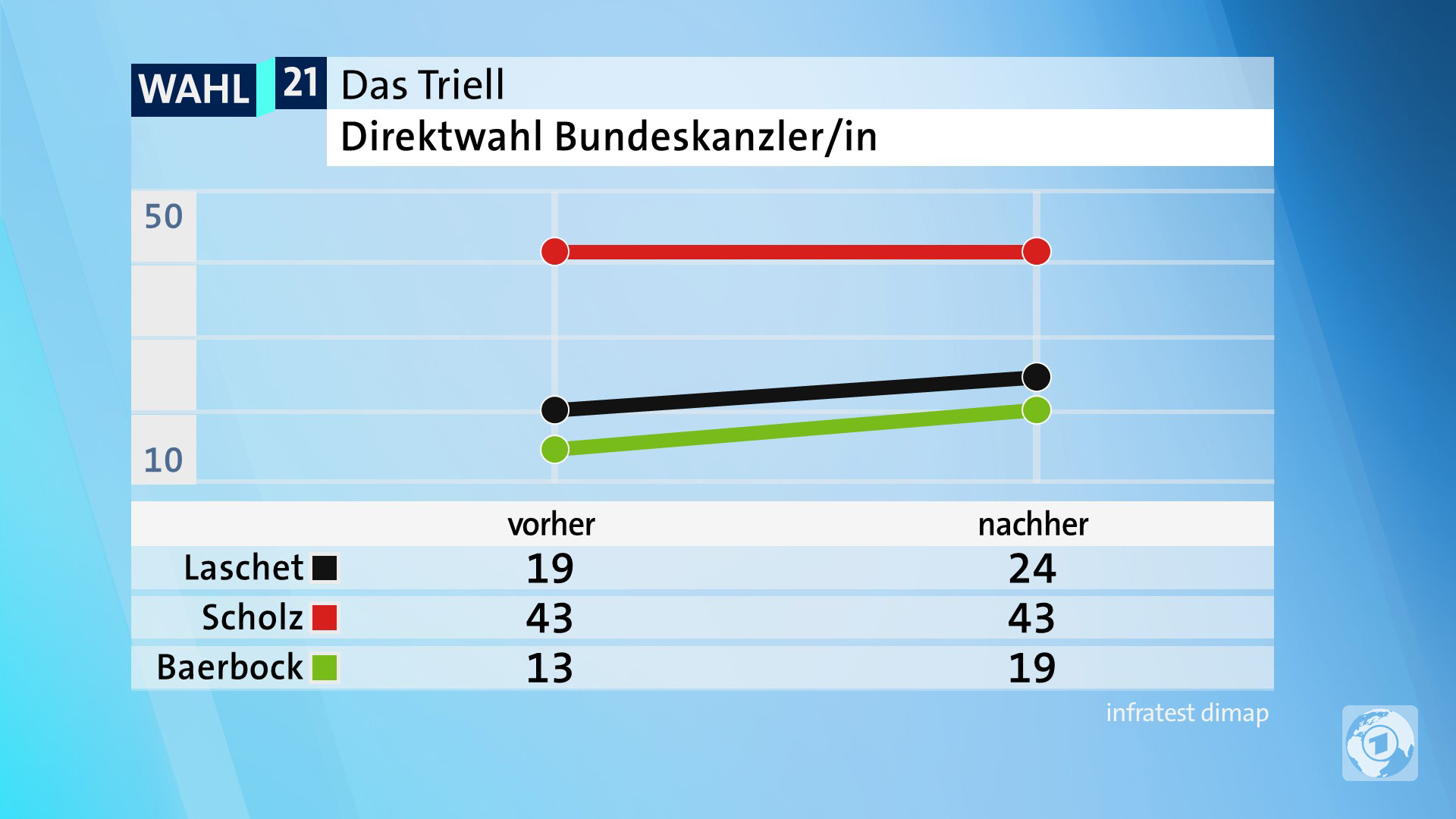 Die Grünen-Bewerberin Baerbock betonte, sie kämpfe mit aller Kraft für einen Aufbruch in Deutschland. "Das geht nur mit Grünen in führender Rolle." Baerbock sagte ebenfalls, nach der Wahl müssten alle demokratischen Parteien miteinander reden. Dabei schloss sie die Linke mit ein. Baerbock warnte vor einer Gleichsetzung der Linken mit der AfD. Das sei "brandgefährlich". Von der Union verlangte sie, dass diese "die Brandmauer nach rechts vollständig schließt".Gefragt nach der umstrittenen Kandidatur des ehemaligen Verfassungsschutz-Chefs Hans-Georg Maaßen für die CDU in Südthüringen sagte CDU-Spitzenkandidat Laschet: "Herr Maaßen wird sich an den Kurs halten müssen, den ich vorgebe als Parteivorsitzender." Auf die Frage, ob er Maaßen, der vielfach mit rassistischen und nationalistischen Äußerungen aufgefallen ist, wählen würde, antwortete Laschet nicht und verwies darauf, dass er selbst in Aachen zur Wahl gehe.