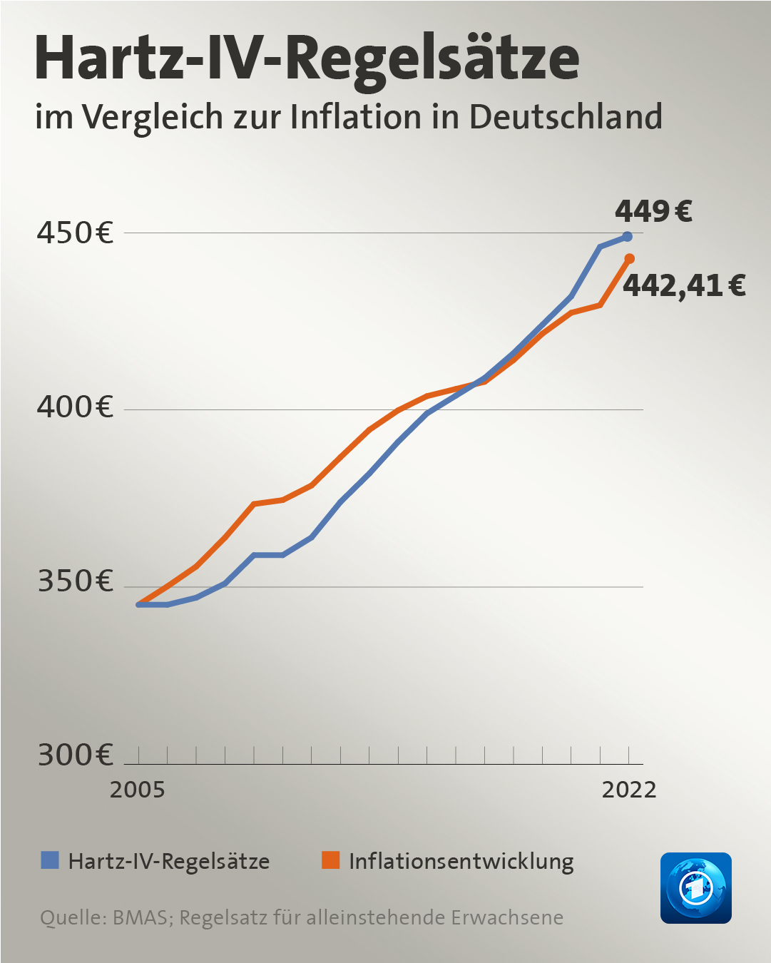 Tatsächlich hat die Inflation Einfluss auf die Hartz-IV-Sätze. Der Vergleich zeigt, dass mit den zurückliegenden Aufstockungen des Regelsatzes für Alleinstehende die Inflationsentwicklung immer wieder ausgeglichen wurde.