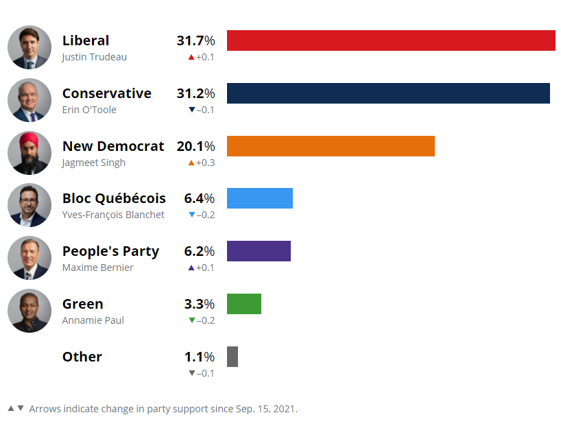 현재 여론조사대로 총선이 끝나게 되면, 캐나다 총선 리버럴 (자유당 Liberal) 과반은 넘지 못해 '마이너리티' 정부 형성할 확률. 리버럴 31.7%, 보수당 31.2%, 신민주당 (NDP) 20.1%, 퀘벡 블록 6.4%, 녹색당 3.3%