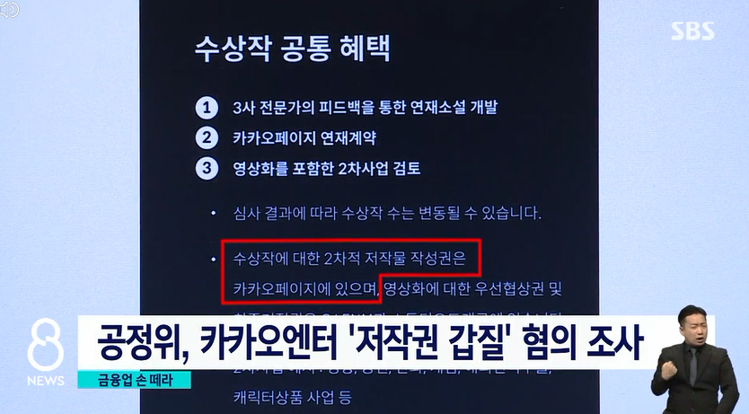 카카오엔터가 일부 웹소설 공모전에서 '수상작의 2차 저작물 작성권은 카카오 측에 있다'고 밝혔는데, 거래상 지위 남용에 해당할 수 있다는 겁니다.