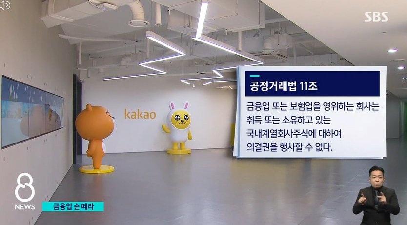 관련법 - 공정거래법 11조. 금융업 또는 보험업 회사는 취득 또는 소유하고 있는 국내계열회사 주식에 대해 의결권을 행사할 수 없다.