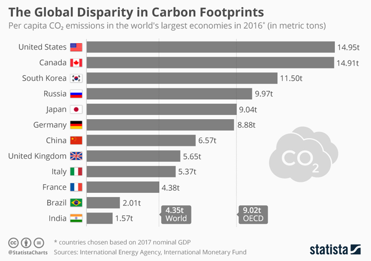 현실 자료. 2016년. 1인당 탄소 배출량, 미국, 캐나다, 한국 순서.