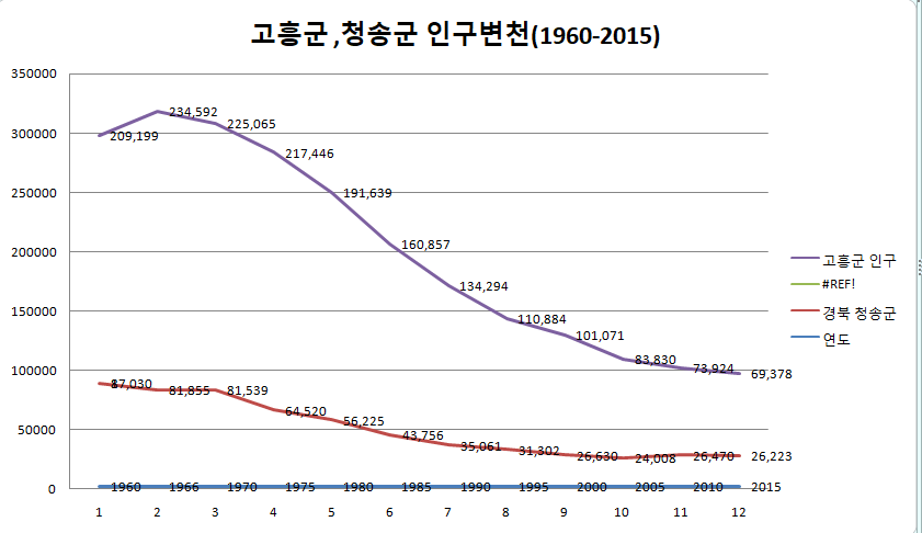 대략 30년 동안 젊은층이 대도시로 이주한 것이다. 1995년 이후는 점진적으로 인구가 감소하는데, 이는 자연사한 동네 주민들의 숫자일 것이다. 1996년 인구의 29% 정도가 현재 고흥에 거주하고 있는 셈이다. 30년 동안 70% 인구 감소량.