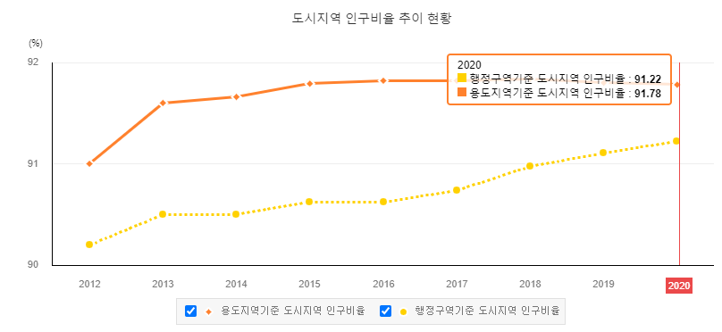 도시화율 2020년 : 91.8% 전체 인구의 91~92%가 도시에 거주함.