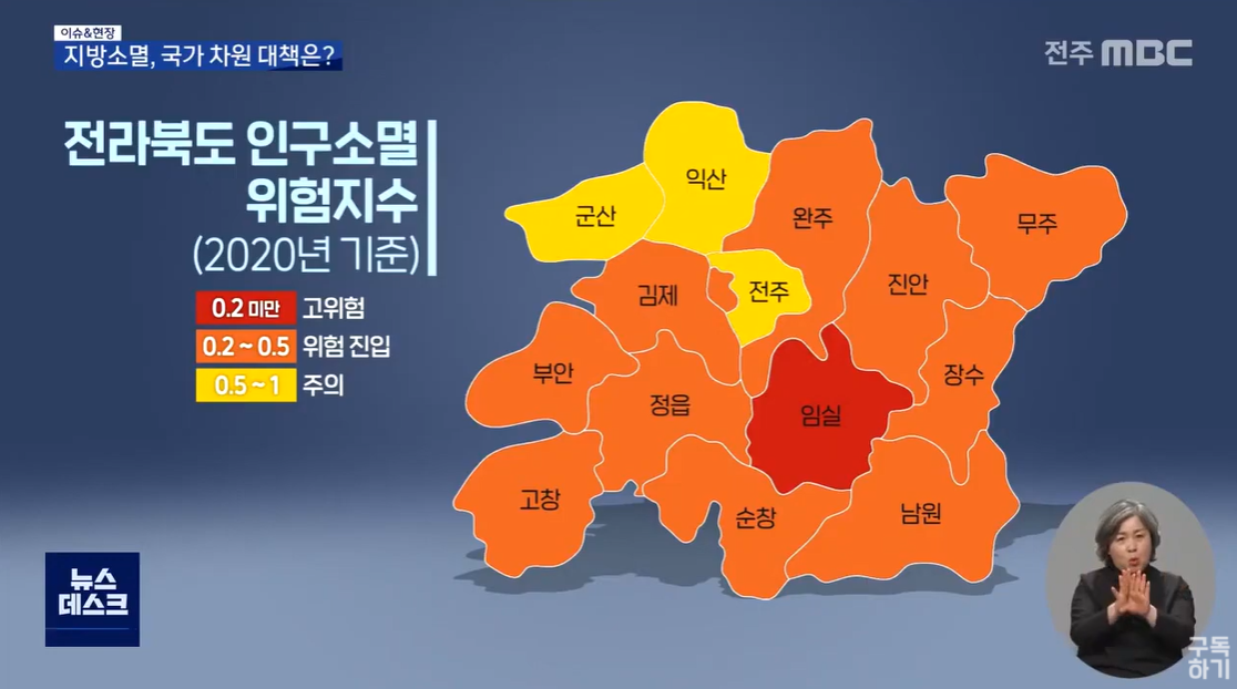 [CG] 인구 10만 이하의 소도시는 물론, 전주와 익산, 군산 등 주요 도시들 역시 소멸 위기에서 자유롭지 않습니다./ 출산장려금과 결혼축하금, 전입장려지원금 등 지방자치단체 차원에서 다양한 유인책을 내놨지만, 도내 인구는 오히려 지난 10년간 6만 5천 명 줄었습니다.