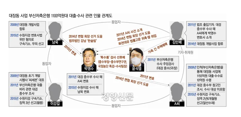 부산저축은행의 대장동 대출 건은 4년 뒤인 2015년 수원지검 특수부가 수사했고, A씨는 알선수재 혐의로 구속기소돼 징역 2년6개월을 확정받았다. 예금보험공사가 대장동 대출금 미회수와 관련해 남 변호사 등을 수사의뢰해 경·검의 수사가 시작되자 이 때도 박 전 특검은 수사 단계에서 남 변호사, A씨의 변호를 맡았다.