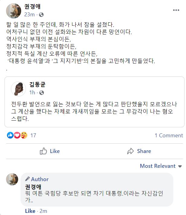 권경애 변호사 페이스북을 보다가 느낀 점. 조국 사태 이후, 정치토론이 얼마나 내용이 없고, 빈곤한 상태로, 감정적인 대립과 힘대결만 있었는가를 보여주다.권경애 변호사도 그 안에 이미 들어가서 반성적 거리를 두지 못하고 있다. 좀 벗어나길 바란다.