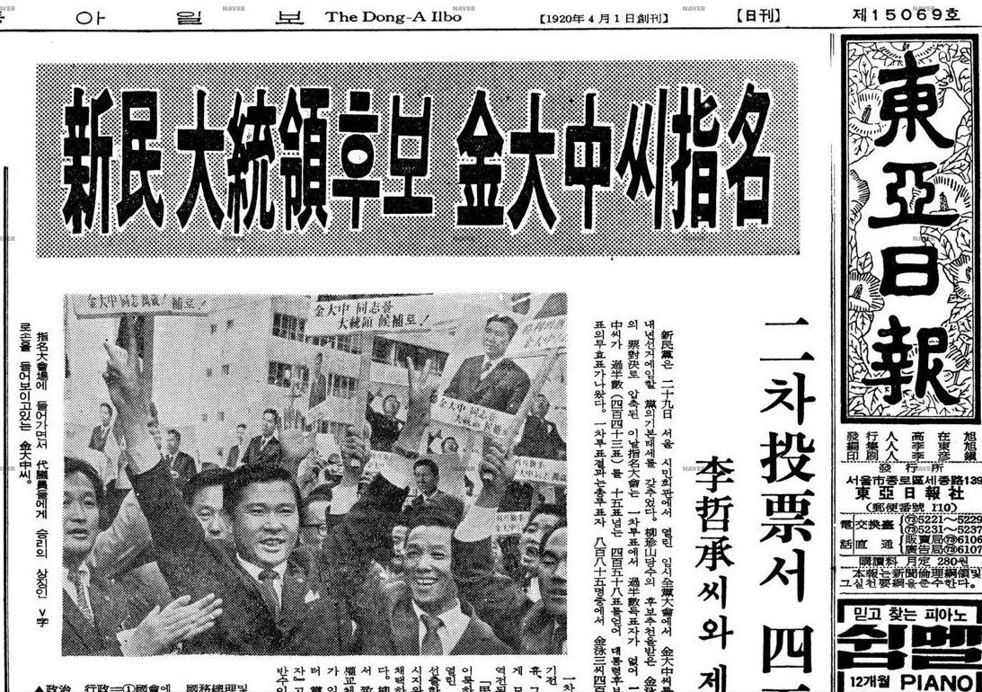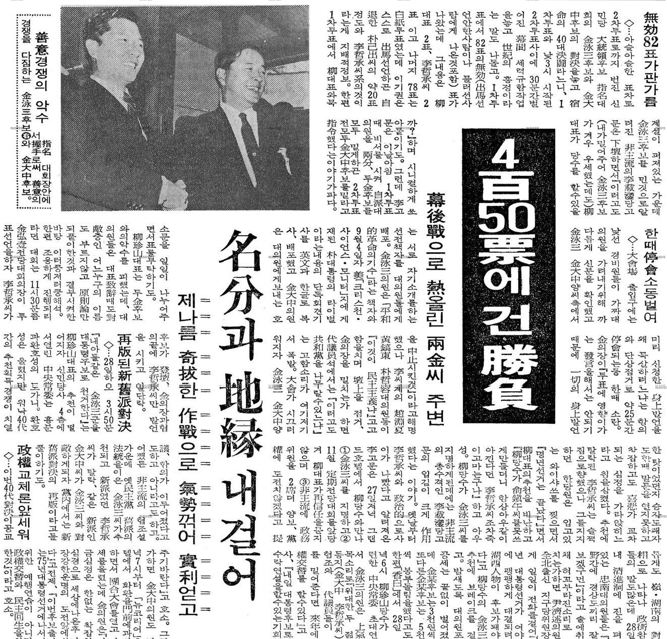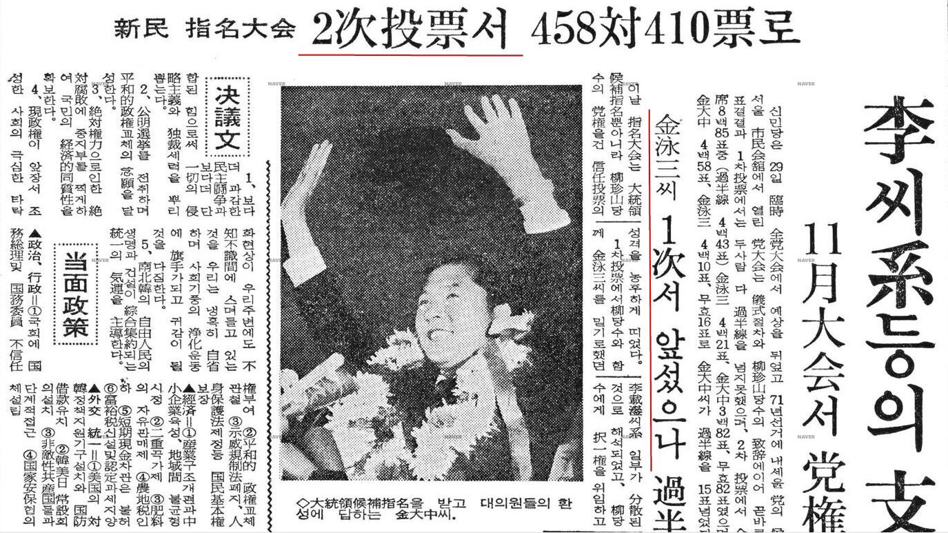 1970년 9월 29일자. 김대중, 김영삼 신민당 대선 후보 경선, 결선투표. 결과.